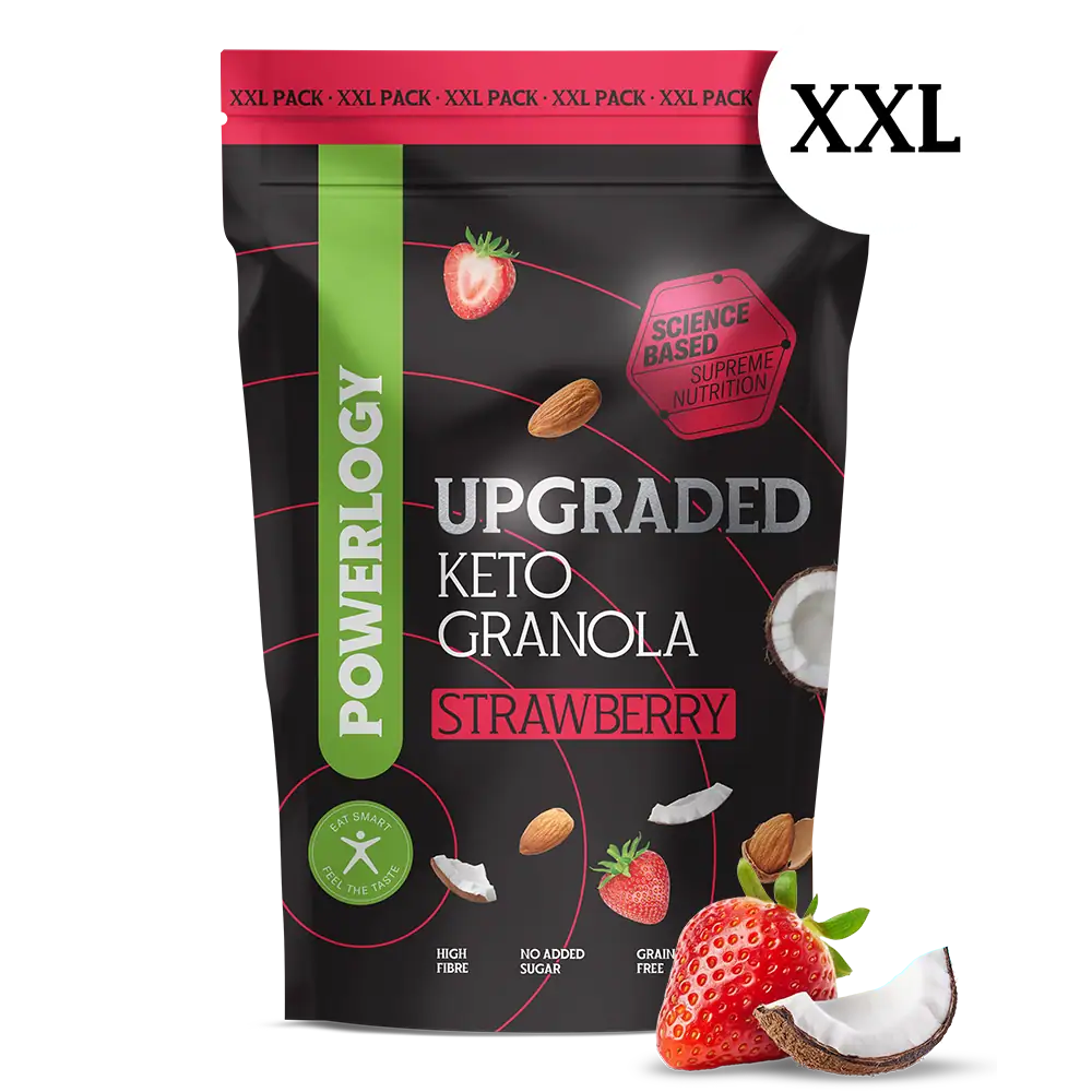 Bežné cereálie stoja na rýchlych sacharidoch – energia vrcholí už do 30–60 minút a následne klesá. Keto Granola Strawberry s nízkym obsahom sacharidov (8 g) a vysokým podielom vlákniny (14 g) doplneným o tuky mení jej uvoľňovanie – nástup energie je plynulejší a priebeh stabilnejší, bez výrazného poklesu.1-3